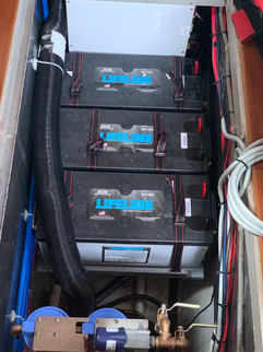 As for the past month, the pics below provide a small glimpse of things we’ve been working on including…a lot of late night wiring, mounting two 110 watt flexible solar panels to the new bimini canvas, installing new AGM batteries, wiring the bow thruster, anchor windlass controls, and navigation monitor to the helm station, installing the Iridium Go satellite antenna so we can use our satellite phone to communicate and to download GRIB files for weather routing, making new rigging to hoist the dinghy out of the water, adding insulation to the ceiling and making new ceiling panels (ours were nearly 40 yrs old), and washing the teak decks and cabin top as well as washing and waxing the hull.